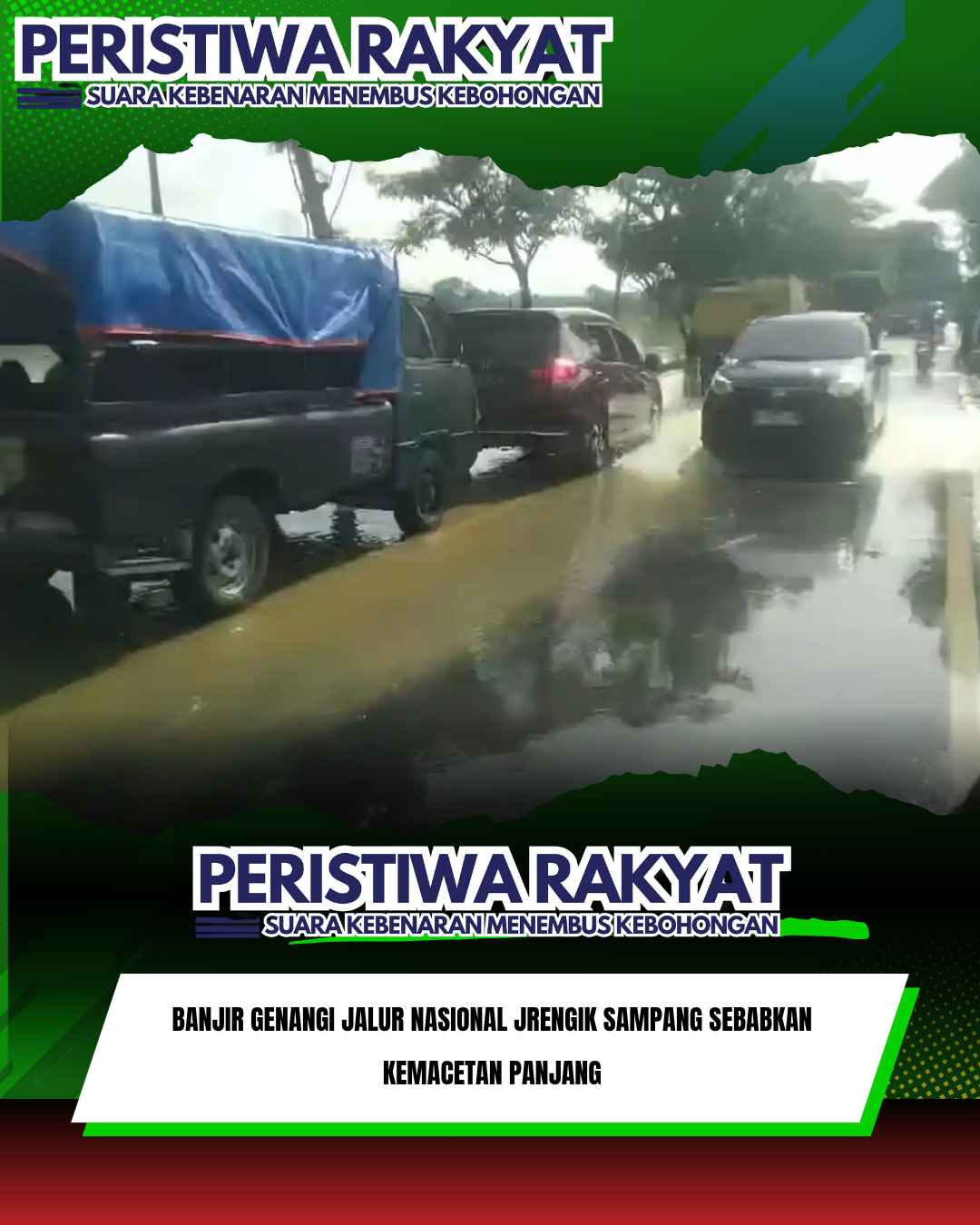 www.peristiwaRakyat.com.ǁSampang,19 November 2025-Jalur Nasional di Kecamatan Jrengik, Kabupaten Sampang, Madura terendam banjir, Rabu (19/11/2025).