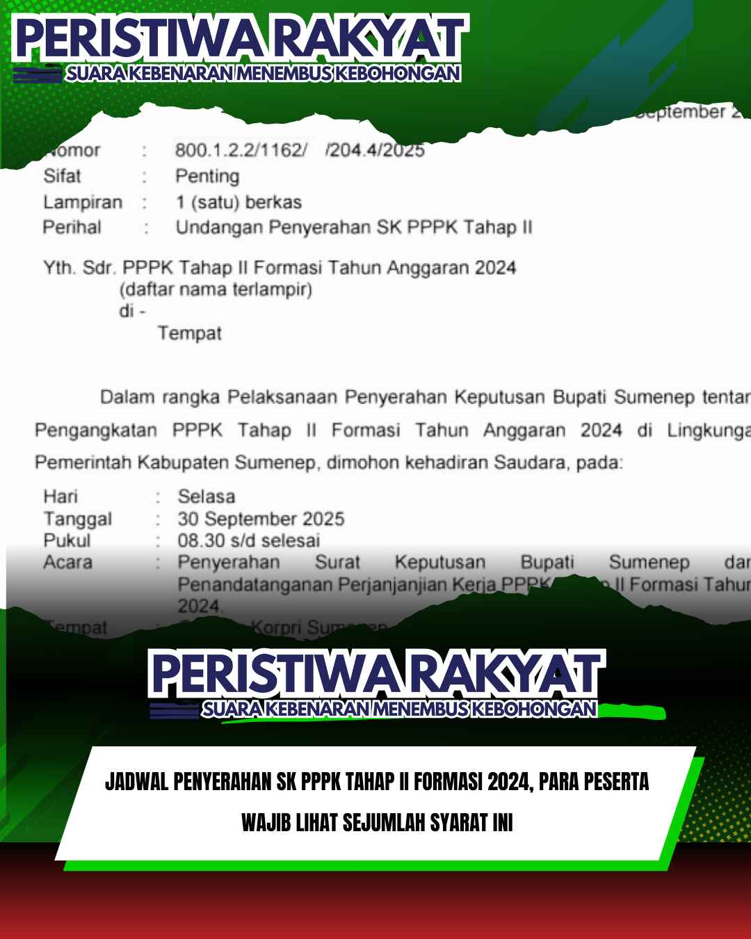 www.peristiwaRakyat.com.ǁSumenep,29 September2025-Pemerintah Kabupaten (Pemkab) Sumenep melalui Badan Kepegawaian dan Pengembangan Sumber Daya Manusia (BKPSDM) akan menyerahkan Surat Keputusan (SK) Pegawai Pemerintah dengan Perjanjian Kerja (PPPK) Tahap II Formasi Tahun Anggaran 2024.