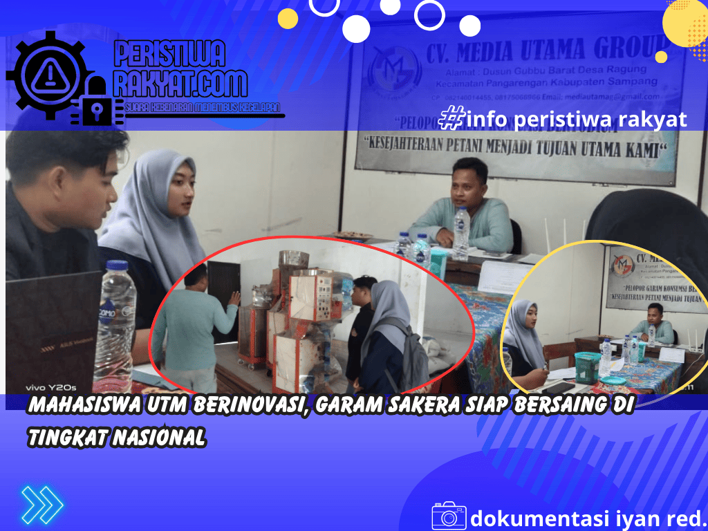 www.peristiwarakyat.com.ǁSampang,8 November 2024- Dalam upaya meningkatkan daya saing produk lokal, sekelompok mahasiswa Universitas Trunojoyo Madura (UTM) berhasil menciptakan inovasi baru pada proses produksi garam di CV Media Utama Group. Penelitian yang dilakukan oleh mahasiswa ini berhasil mengidentifikasi beberapa potensi peningkatan kualitas dan efisiensi produksi garam cap Sakera, salah satu produk unggulan perusahaan CV.Media Utama Group.