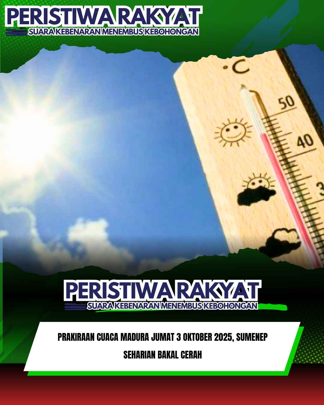 www.peristiwaRakyat.com.ǁSumenep,3 Oktober 2025-Menurut laporan Badan Meteorologi Klimatologi dan Geofisika (BMKG), sebagian besar wilayah Madura akan cerah.