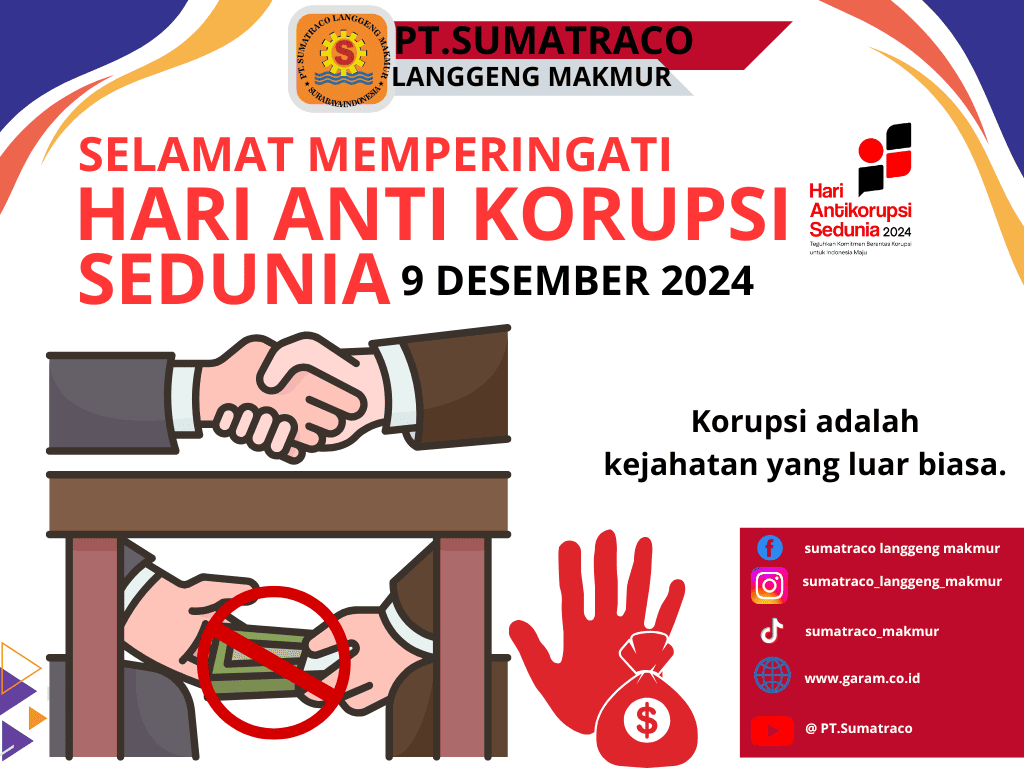Dengan peringatan Hari Anti Korupsi Sedunia ini, PT Sumatraco Langgeng Makmur semakin menunjukkan komitmennya untuk beroperasi dengan penuh integritas dan tanggung jawab, menjadikannya sebagai contoh perusahaan yang mengutamakan transparansi dan etika dalam menjalankan bisnis.